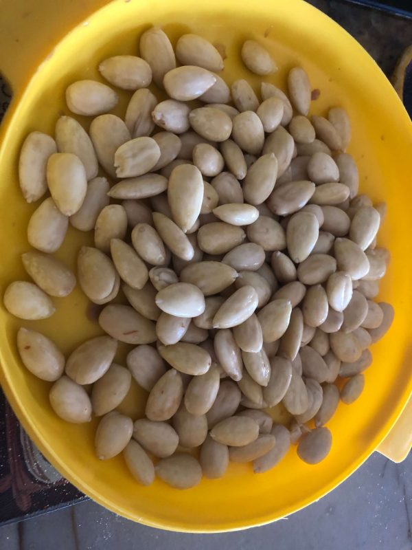 - Soak the almonds for an hour or two in hot water. Peel them. Alternate: You may also soak overnight in regular water. To peel, simple hold the almond between your thumb and forefinger, and squeeze, the almond should pop out