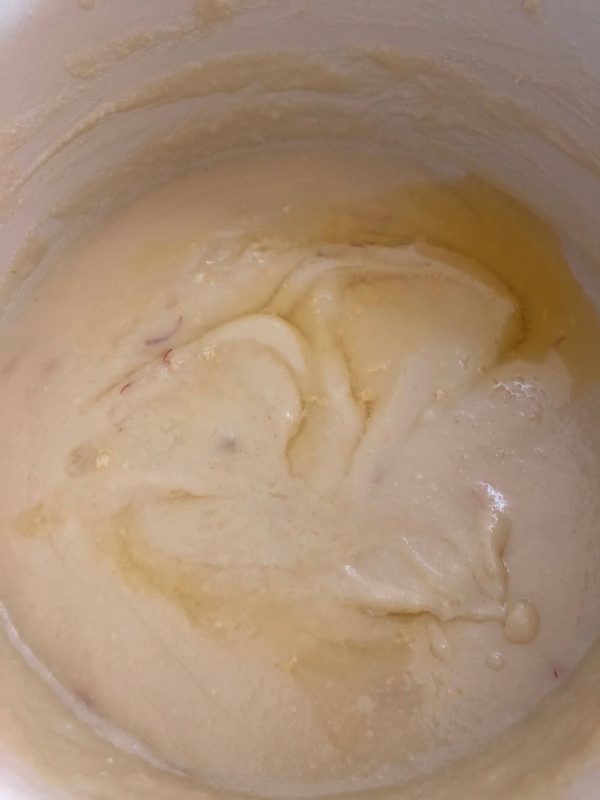 - When the liquid condenses into a mass, add the ghee a little bit at a time, and continue to stir. Also, add the saffron soaked in milk when the paste has cooked a litlte bit.