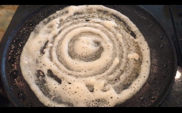 - Heat the pan. The best, golden, crispy dosas ONLY come out of cast iron pans. Non stick, while not healthy, also do not make golden dosas - the color is usually a bit pale. I am a bit of a purist as are many south Indians, as far as making dosas go. I might use a non stick in an emergency, but cast iron is my preferred pan. It does great in retaining heat, and is healthier. If you use the same pan you use for rotis, there is a chance it's dried up. You will need to season it with oil, and test it with a small dosa first. You may also go over the pan with a cut up half onion to season it as you make dosas. Get it to the right temperature, and you're golden!