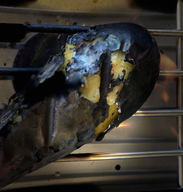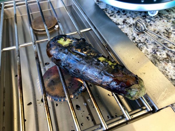 - Using a pair of tongs, smoke the eggplant directly on the stove, turning every minute or so to evenly cook all sides; the eggplant would change color from purple to a brown as it cooks