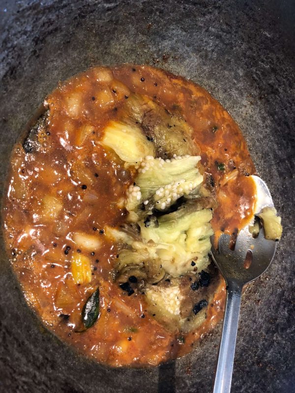 - Add the eggplant, 1/2 tsp of salt for the eggplant, and mash it well in the tamarind broth