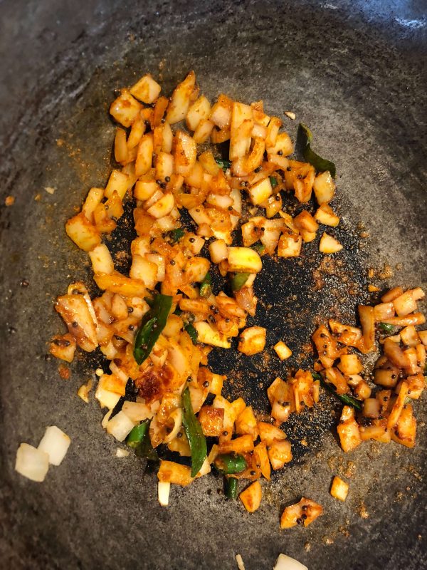 - Add the sambar/kozhambu powder and cook for a minute or so
