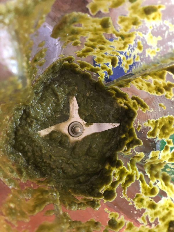 - Blend green chilies salt, jaggery, tamarind (paste or extract) into a fine paste