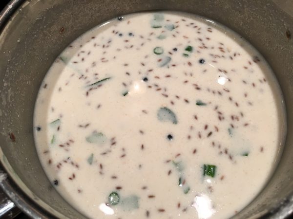 - Add the curry leaves, cilantro, green chilies, peppercorns