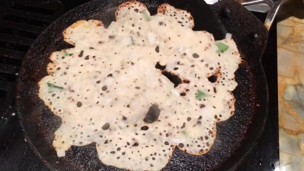 - Make as much of a circle as possible. I have not perfected a circle in rava dosa. Drizzle a teaspoon of oil around the edges, in between the holes and in the center